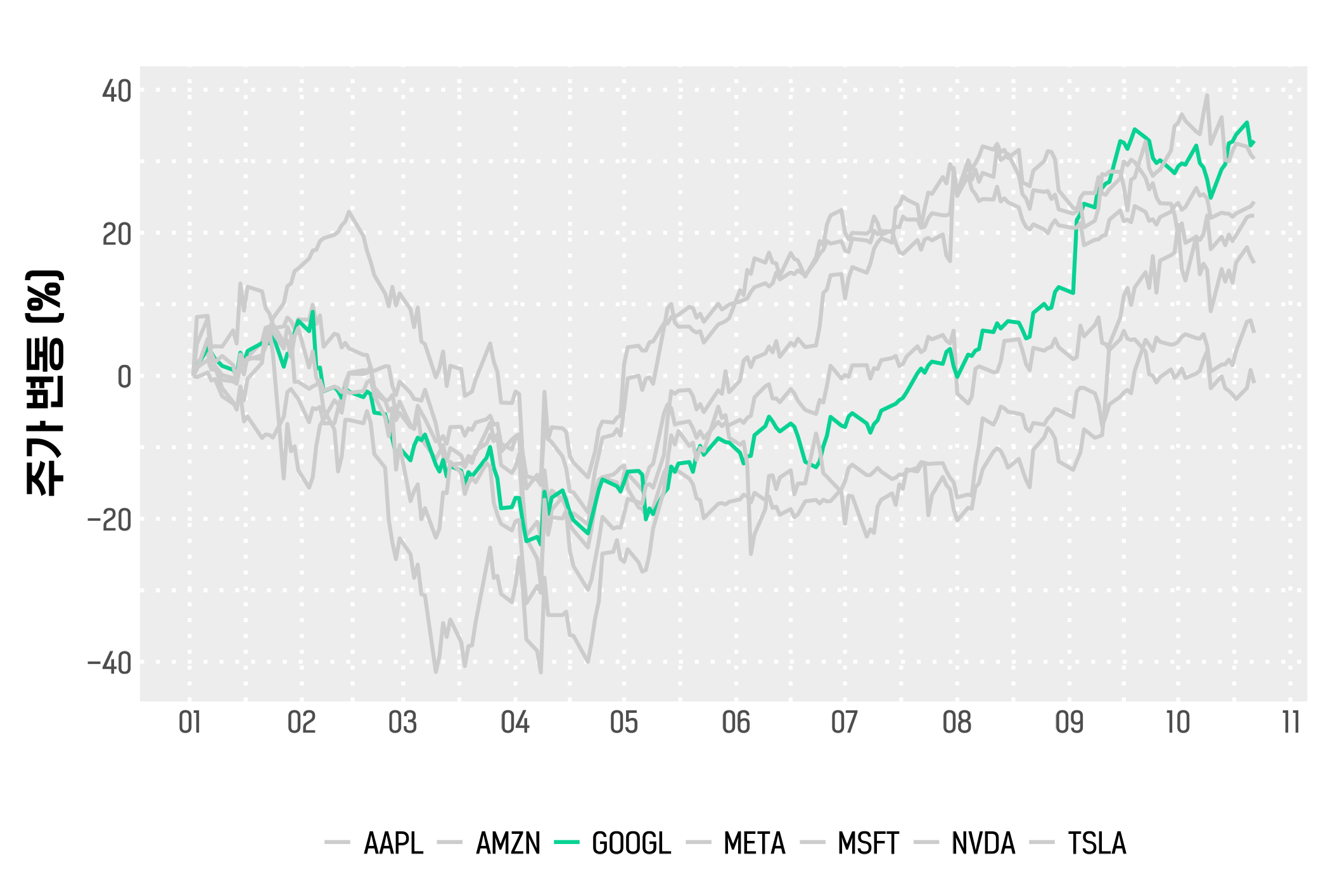 ํฌ 7์ธ๋ฐฉ, M7 ๊ฐ์ด๋ฐ ์ง๊ธ ์์น์ธ๋ง ๋ณด๋ฉด ๊ตฌ๊ธ์ ํ๋ฆ์ด ๊ฐ์ฅ ๋์ ๋์ด. ์ง๋ ๋ฉํํธ์์ M7์ ์ํฉ์ ๋ค๋ฃฐ ๋๋ง ํ๋๋ผ๋ ๊ตฌ๊ธ์ ์ฐ์ด์ ๋น๊ตํ๋ฉด ์ฃผ๊ฐ๊ฐ ๋ง์ด๋์ค์๋ ๊ฒ ๊ธฐ์ต๋? ๊ตฌ๊ธ ๋๋ฆ๋๋ก AI ๊ธฐ์  ๊ฐ๋ฐ์ ๋ฐ์ฐจ๋ฅผ ๊ฐํ์ง๋ง ์๋น๋์, ๋ฉํ, MS์๋ ๋ฌ๋ฆฌ ์ฃผ์ ์์ฅ์ ํ๊ฐ๋ ๊ฐํนํ์์ง. ํ์ง๋ง ์ง๊ธ์ ๋ฌ๋ผ. 10์ 22์ผ ๊ธฐ์ค์ผ๋ก M7 ๊ธฐ์