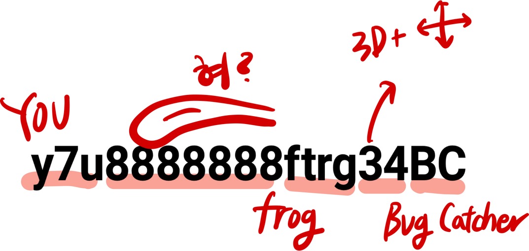 y7u๋ YOU์ด๊ณ 8888888์ 8์ด ๊ธธ๊ฒ ๋ป์ด ์๋ ๋ชจ์์ด๋๊น ํ๋ฅผ ์๋ฏธํด. ftrg๋ frog, ๊ฐ๊ตฌ๋ฆฌ๋ฅผ ๋นํผ ๊ฑฐ๊ณ 3D๋ก ๋ค ๋ฐฉํฅ์ผ๋ก ์์ง์ด๋ Bug Catcher? ์ํ, 3D ๊ฐ๊ตฌ๋ฆฌ ๋ฒ๋ ์ก๊ธฐ ๊ฒ์์ ๋ง๋ค๋ผ๋ ๊ฑฐ๊ตฌ๋! |